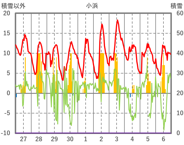 | 日 | 時 | 気温 | 降水 | 風向/風速 | 日照 | 積雪 | 降雪 |