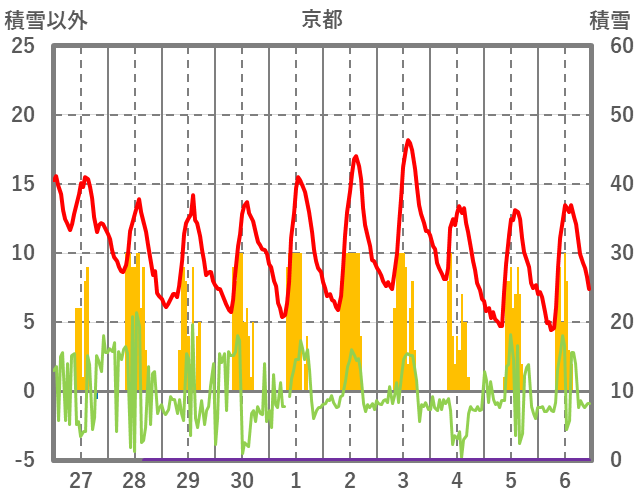| 日 | 時 | 気温 | 降水 | 風向/風速 | 日照 | 積雪 | 降雪 |