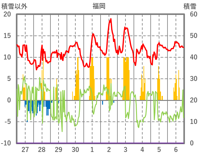 | 日 | 時 | 気温 | 降水 | 風向/風速 | 日照 | 積雪 | 降雪 |