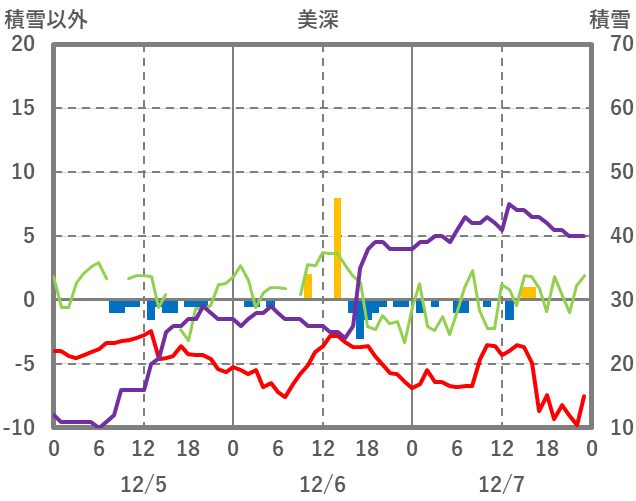 | 日 | 時 | 気温 | 降水 | 風向/風速 | 日照 | 積雪 | 降雪 |
