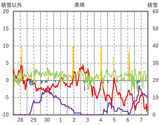 | 日 | 時 | 気温 | 降水 | 風向/風速 | 日照 | 積雪 | 降雪 |