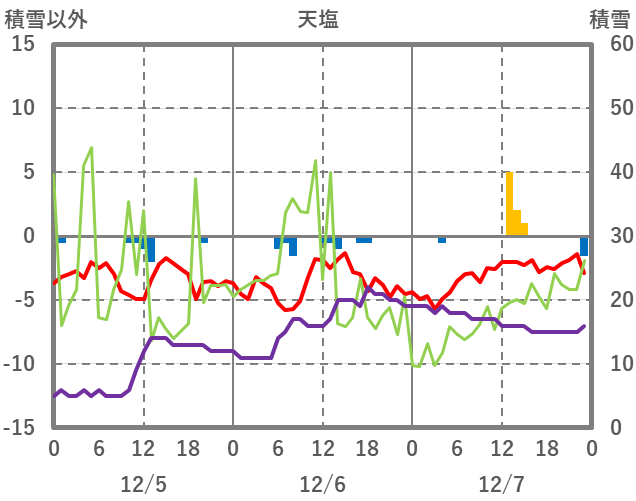 | 日 | 時 | 気温 | 降水 | 風向/風速 | 日照 | 積雪 | 降雪 |