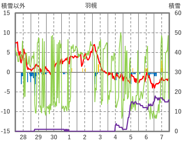 | 日 | 時 | 気温 | 降水 | 風向/風速 | 日照 | 積雪 | 降雪 |