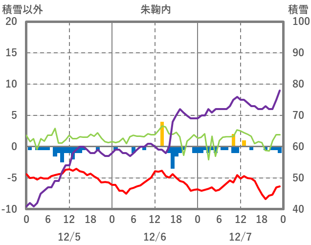 | 日 | 時 | 気温 | 降水 | 風向/風速 | 日照 | 積雪 | 降雪 |
