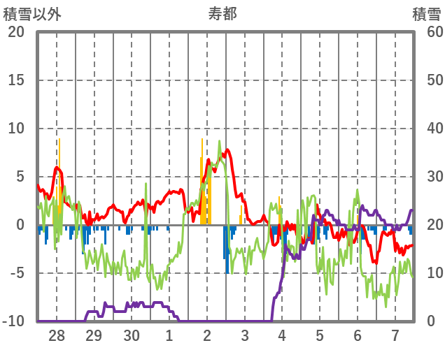 | 日 | 時 | 気温 | 降水 | 風向/風速 | 日照 | 積雪 | 降雪 |