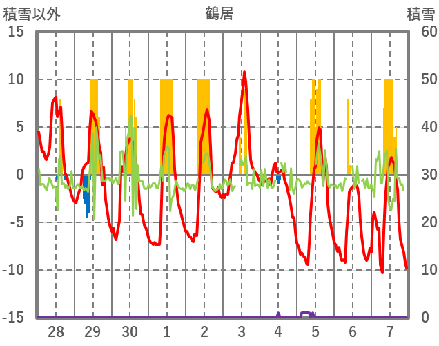 | 日 | 時 | 気温 | 降水 | 風向/風速 | 日照 | 積雪 | 降雪 |