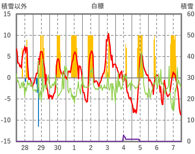 | 日 | 時 | 気温 | 降水 | 風向/風速 | 日照 | 積雪 | 降雪 |