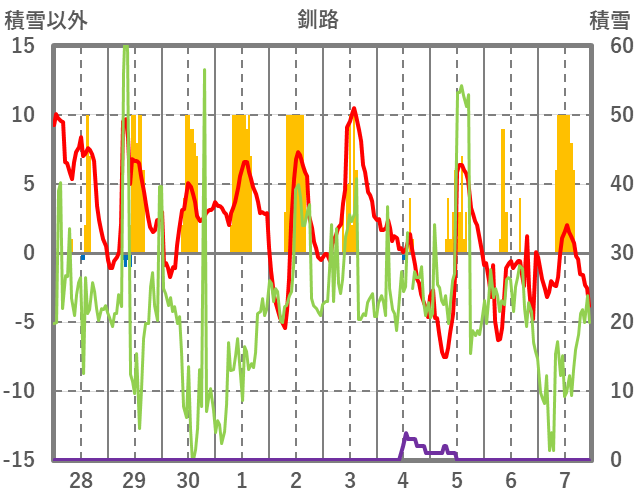 | 日 | 時 | 気温 | 降水 | 風向/風速 | 日照 | 積雪 | 降雪 |