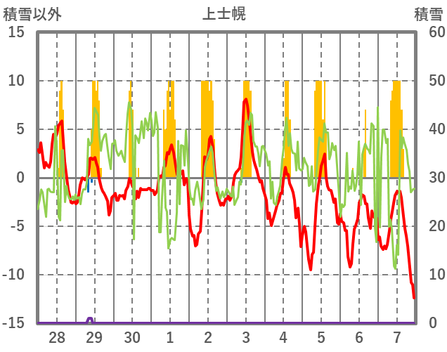 | 日 | 時 | 気温 | 降水 | 風向/風速 | 日照 | 積雪 | 降雪 |