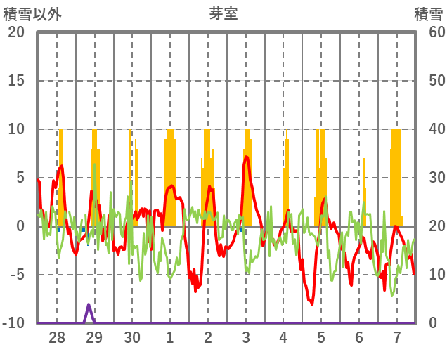 | 日 | 時 | 気温 | 降水 | 風向/風速 | 日照 | 積雪 | 降雪 |