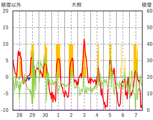 | 日 | 時 | 気温 | 降水 | 風向/風速 | 日照 | 積雪 | 降雪 |
