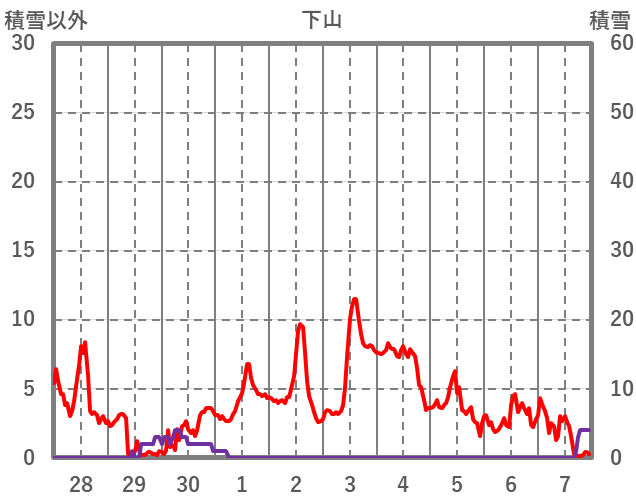 | 日 | 時 | 気温 | 降水 | 風向/風速 | 日照 | 積雪 | 降雪 |