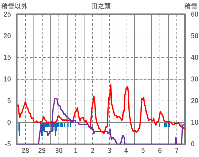 | 日 | 時 | 気温 | 降水 | 風向/風速 | 日照 | 積雪 | 降雪 |