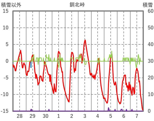 | 日 | 時 | 気温 | 降水 | 風向/風速 | 日照 | 積雪 | 降雪 |
