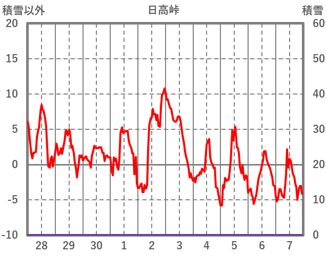 | 日 | 時 | 気温 | 降水 | 風向/風速 | 日照 | 積雪 | 降雪 |