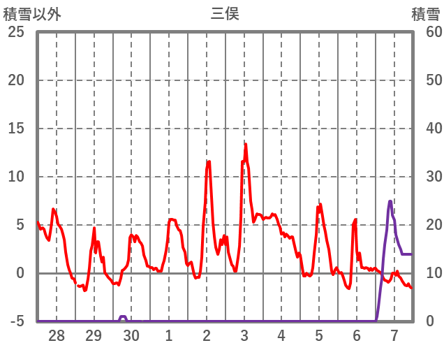 | 日 | 時 | 気温 | 降水 | 風向/風速 | 日照 | 積雪 | 降雪 |