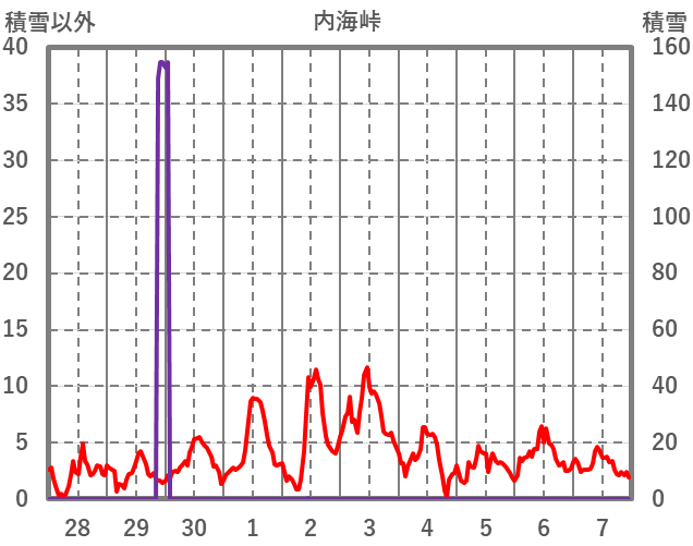 | 日 | 時 | 気温 | 降水 | 風向/風速 | 日照 | 積雪 | 降雪 |