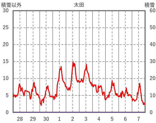 | 日 | 時 | 気温 | 降水 | 風向/風速 | 日照 | 積雪 | 降雪 |