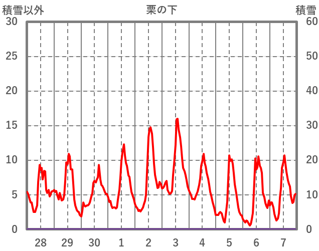 | 日 | 時 | 気温 | 降水 | 風向/風速 | 日照 | 積雪 | 降雪 |
