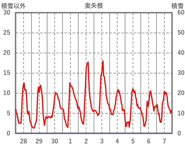 | 日 | 時 | 気温 | 降水 | 風向/風速 | 日照 | 積雪 | 降雪 |