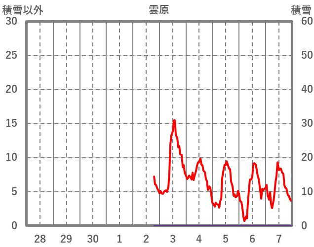 | 日 | 時 | 気温 | 降水 | 風向/風速 | 日照 | 積雪 | 降雪 |