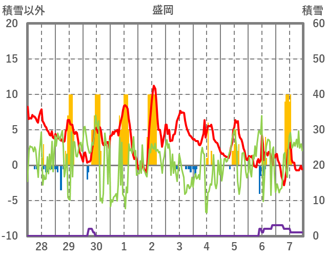 | 日 | 時 | 気温 | 降水 | 風向/風速 | 日照 | 積雪 | 降雪 |