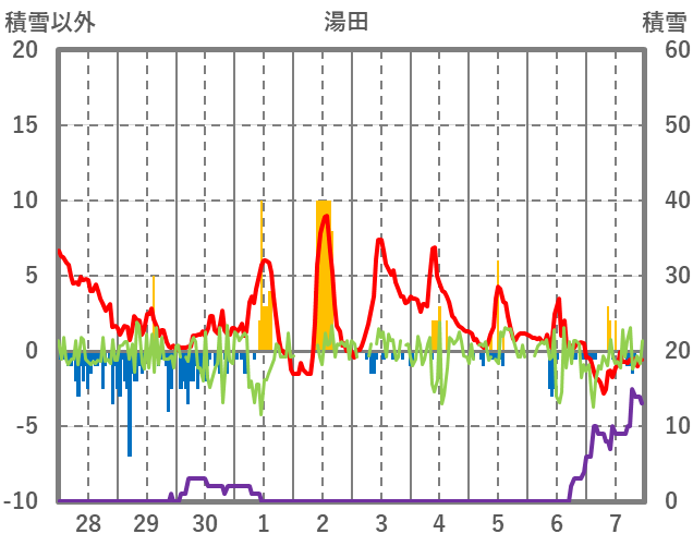 | 日 | 時 | 気温 | 降水 | 風向/風速 | 日照 | 積雪 | 降雪 |
