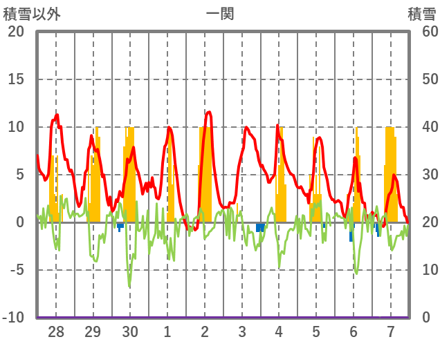 | 日 | 時 | 気温 | 降水 | 風向/風速 | 日照 | 積雪 | 降雪 |