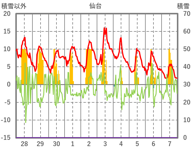 | 日 | 時 | 気温 | 降水 | 風向/風速 | 日照 | 積雪 | 降雪 |