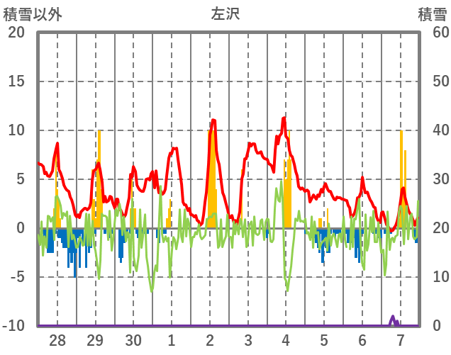 | 日 | 時 | 気温 | 降水 | 風向/風速 | 日照 | 積雪 | 降雪 |