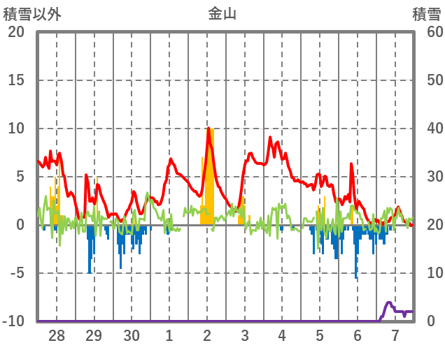 | 日 | 時 | 気温 | 降水 | 風向/風速 | 日照 | 積雪 | 降雪 |