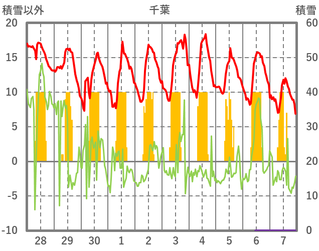| 日 | 時 | 気温 | 降水 | 風向/風速 | 日照 | 積雪 | 降雪 |