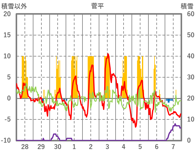 | 日 | 時 | 気温 | 降水 | 風向/風速 | 日照 | 積雪 | 降雪 |