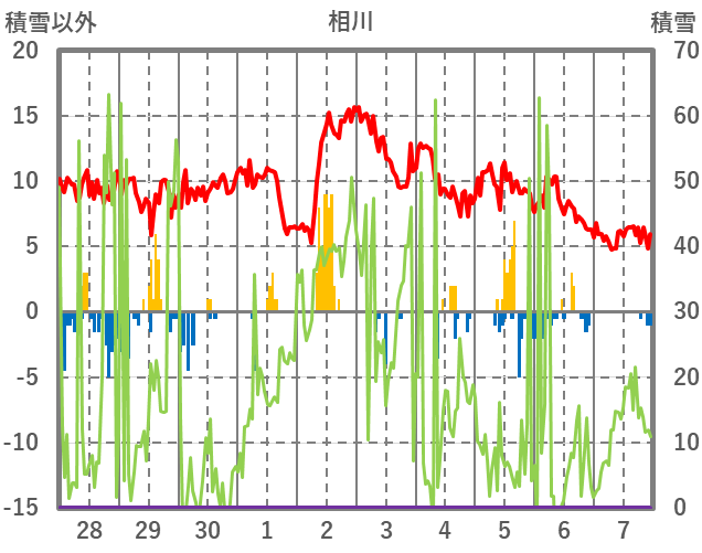 | 日 | 時 | 気温 | 降水 | 風向/風速 | 日照 | 積雪 | 降雪 |