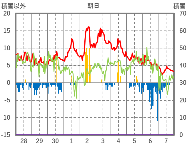 | 日 | 時 | 気温 | 降水 | 風向/風速 | 日照 | 積雪 | 降雪 |