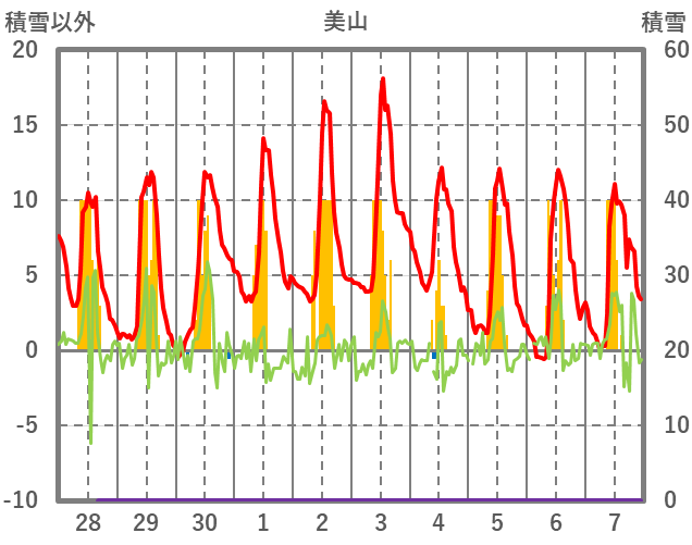 | 日 | 時 | 気温 | 降水 | 風向/風速 | 日照 | 積雪 | 降雪 |