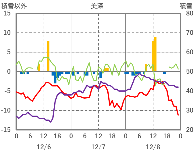 | 日 | 時 | 気温 | 降水 | 風向/風速 | 日照 | 積雪 | 降雪 |