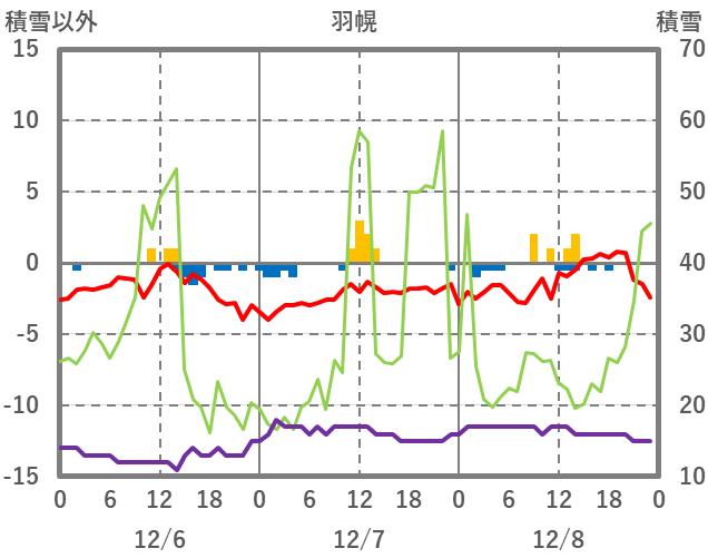 | 日 | 時 | 気温 | 降水 | 風向/風速 | 日照 | 積雪 | 降雪 |