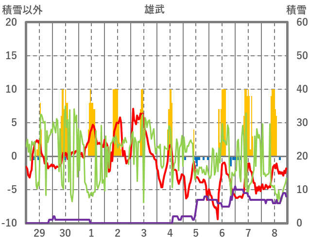 | 日 | 時 | 気温 | 降水 | 風向/風速 | 日照 | 積雪 | 降雪 |