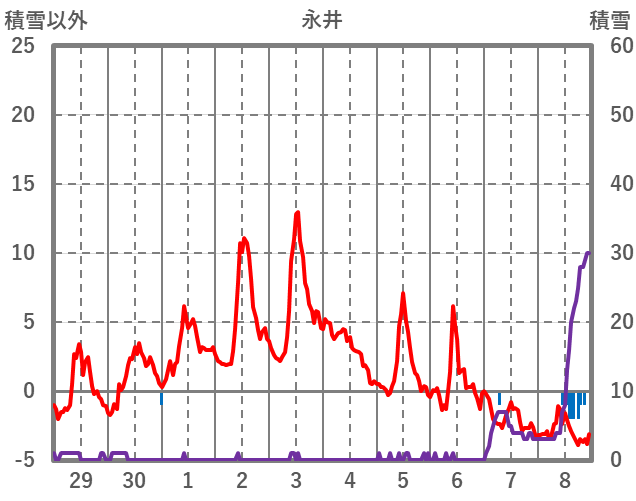 | 日 | 時 | 気温 | 降水 | 風向/風速 | 日照 | 積雪 | 降雪 |