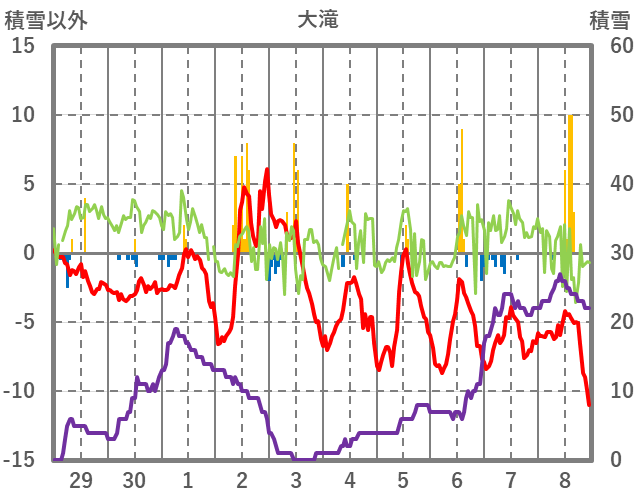 | 日 | 時 | 気温 | 降水 | 風向/風速 | 日照 | 積雪 | 降雪 |