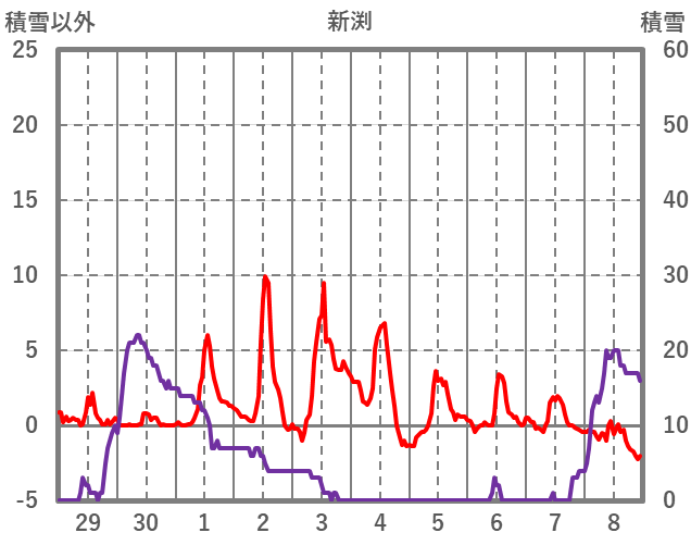 | 日 | 時 | 気温 | 降水 | 風向/風速 | 日照 | 積雪 | 降雪 |