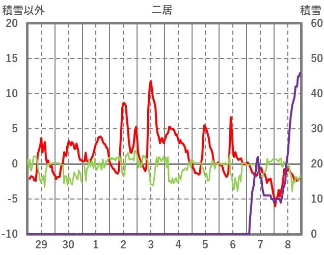 | 日 | 時 | 気温 | 降水 | 風向/風速 | 日照 | 積雪 | 降雪 |