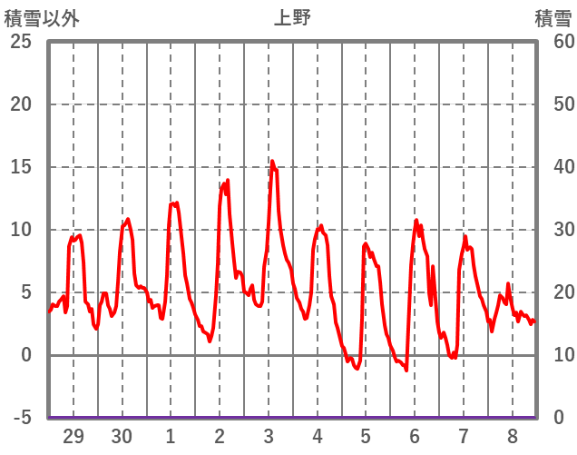 | 日 | 時 | 気温 | 降水 | 風向/風速 | 日照 | 積雪 | 降雪 |