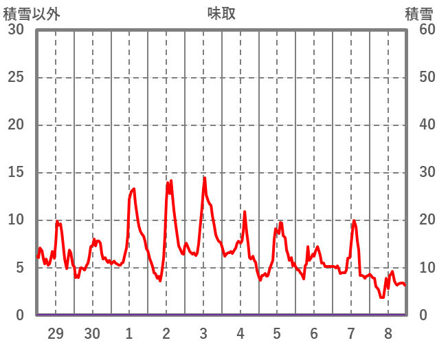 | 日 | 時 | 気温 | 降水 | 風向/風速 | 日照 | 積雪 | 降雪 |