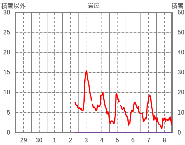 | 日 | 時 | 気温 | 降水 | 風向/風速 | 日照 | 積雪 | 降雪 |
