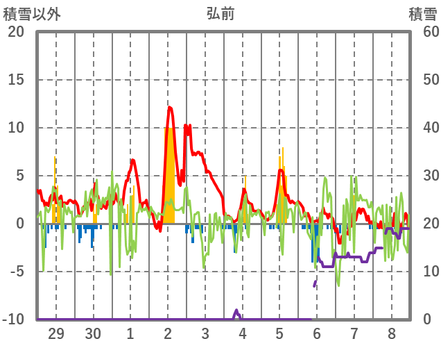 | 日 | 時 | 気温 | 降水 | 風向/風速 | 日照 | 積雪 | 降雪 |