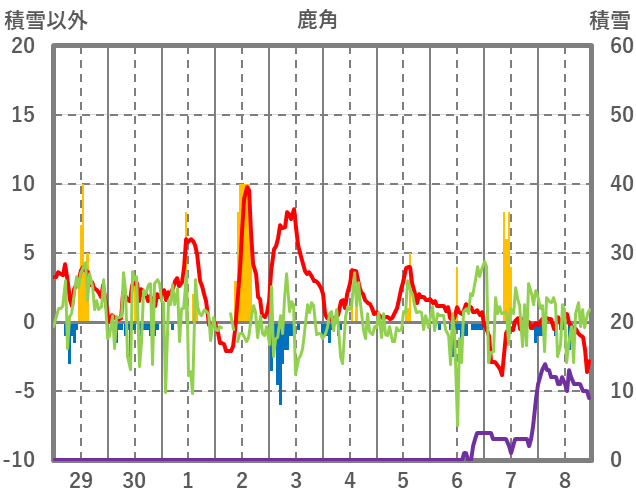 | 日 | 時 | 気温 | 降水 | 風向/風速 | 日照 | 積雪 | 降雪 |
