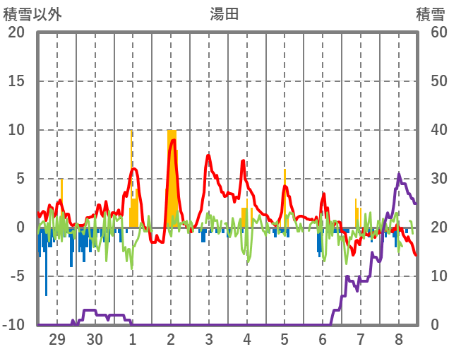 | 日 | 時 | 気温 | 降水 | 風向/風速 | 日照 | 積雪 | 降雪 |