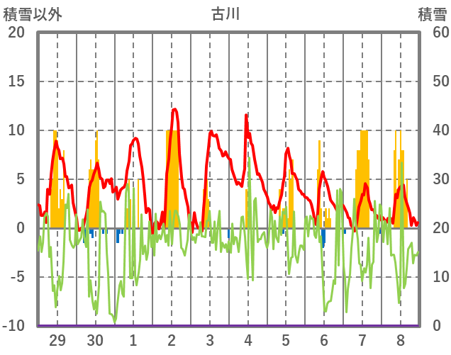 | 日 | 時 | 気温 | 降水 | 風向/風速 | 日照 | 積雪 | 降雪 |